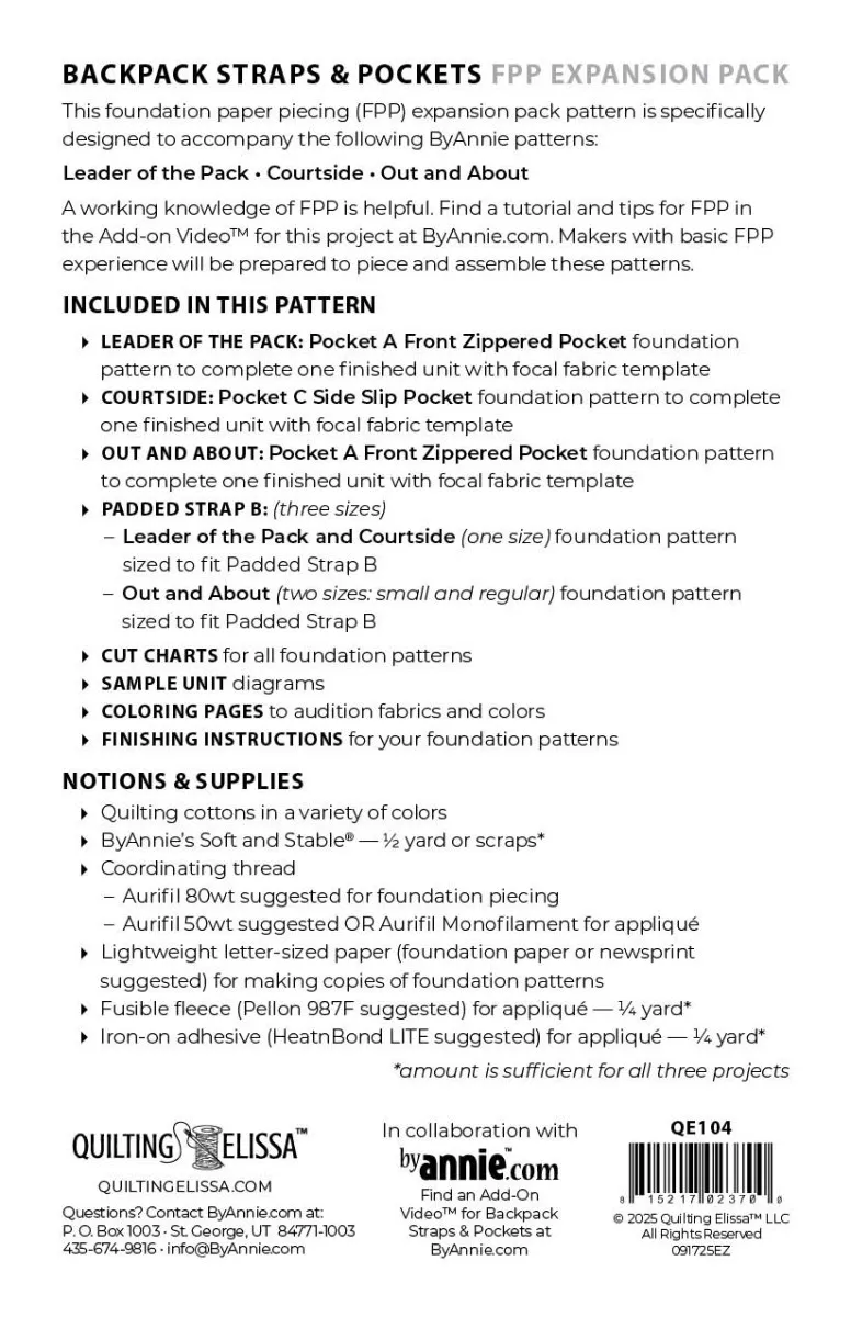 Quilting Elissa hat dieses FPP (Foundation Paper Piecing) Erweiterungspaket speziell entwickelt, um Rucksackträger und Taschen bei drei ByAnnie-Schnittmustern anzupassen: Leader of the Pack, Courtside und Out and About.