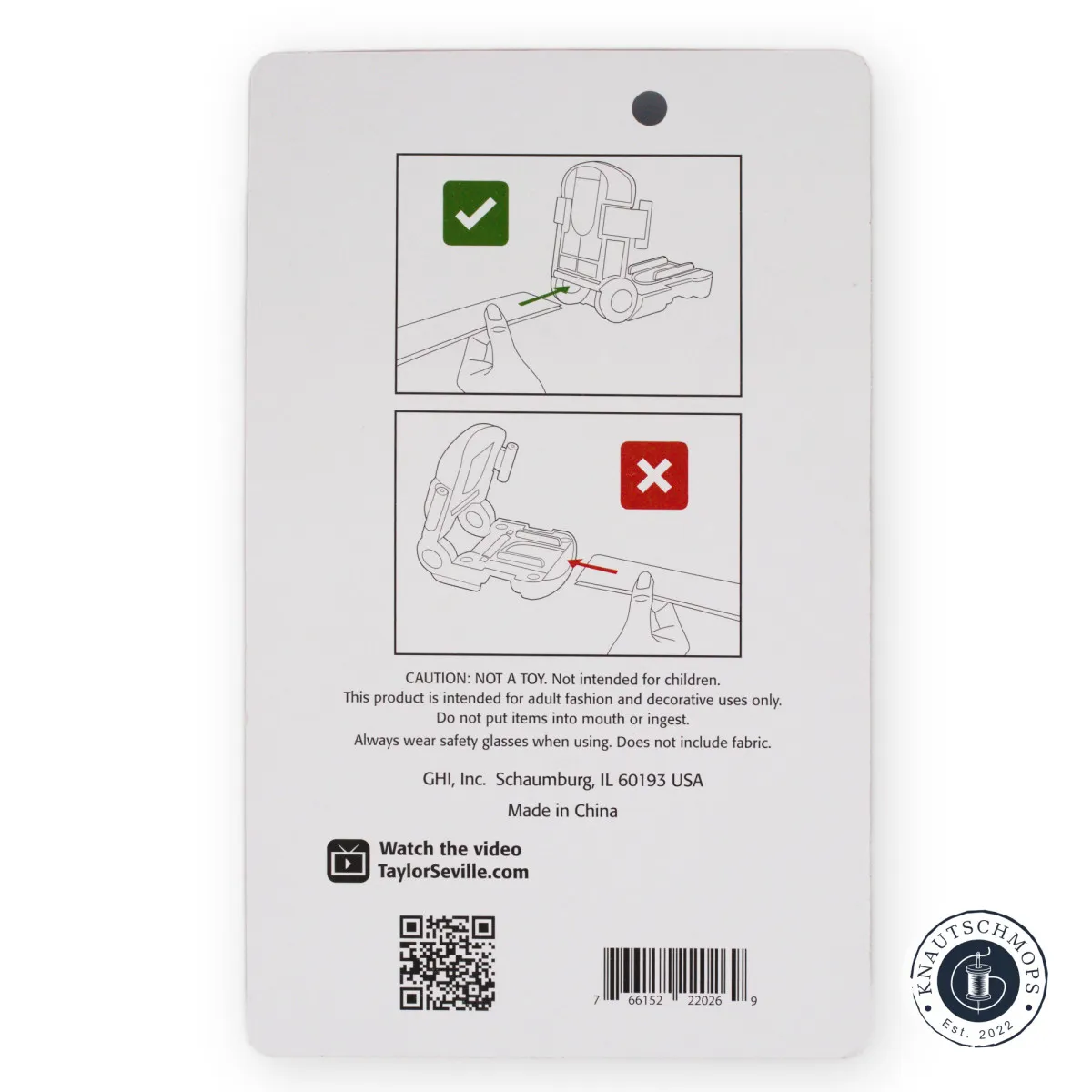 Du erhälts einen Magic Binding Maker für 2 1/2" breite Stoffstreifen und eine passende Spule zum Aufbewahren des fertigen Bindings.